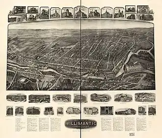 The surrounding town of Windham was founded in 1693 on land bequeathed by the Mohegan people. The first settler in what is now Willimantic was Samuel Ashley, who bought property there in 1717.[12] Until it was industrialized, the area was called "Willimantic Falls".[13] The first mill to be established was a picking and carding facility for wool, in 1806. Other mills followed, most notably a series of thread mills starting in 1822.[12] As the city grew, it was incorporated as a borough in 1833.[14] Willimantic became known as "Thread City" for the proliferation of textile mills, primarily thread, along the river.[15]