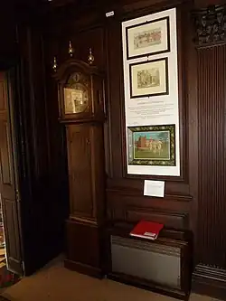 The central bay protrudes towards the street and features the main entrance at ground-floor level.[1] The door is wood with eight panels, it is surrounded by panelled pilasters, painted white, and surmounted by an entablature featuring a central cusp.[1][2] The door is reached by two stone steps, though step-free disabled access is possible by an adjoining building.[1][4] Because of the historic nature of the structure it has not been considered appropriate to install a lift or stair lift to provide step-free access to the upper floors.[4] The windows are of the sash type. The windows on the upper two storeys have bolection moulded brick surrounds; those on the first floor are capped with segment-shaped moulding and those on the second storey with straight moulding.[2] The ground-floor windows have plain surrounds.[1]