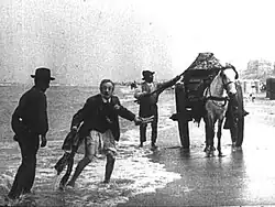 Besides showing movies, Alberts Frères quickly started making them. Often focusing on comedy, the Mullens brothers pulled practical jokes and filmed them, and along the way generated headlines and built a reputation.[6] Their most successful production is also one of the oldest surviving Dutch fictional movies, The Misadventure of a French Gentleman Without Pants at the Zandvoort Beach, which in 2007 was "canonized" as one of sixteen canonical films by the Netherlands Film Festival.[7] The six-minute film, consisting of eight scenes, was filmed by Albert and directed by Willy, the latter also playing the lead after the intended actor was not allowed (by his fiancée) to appear pantless on-camera.