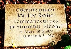 After the war Rohr was assigned in 1920 to Reichswehr Infantry Regiment 29 of the Provisional Reichswehr. With the formation to the 100,000-man army in 1921, he was dismissed and put at its disposition under the title of a lieutenant colonel. Since the major received no suitable command in the Reichswehr and had to take supply jobs on the staff, he decided to officially resign his post.[11] Thus the Reichswehr deprived itself of one of its most capable soldiers.[12] Rohr found a new home in Lübeck, where he died while a director of the Lübecker Getreidebank.[13]