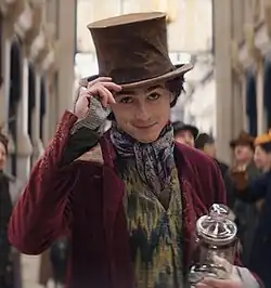 Chalamet's take on the character received mixed reviews.[33] Courtney Howard of The A.V. Club praised Chalamet's performance: "His magical emcee isn’t too far off from Gene Wilder’s as glimpsed in his physicality and vocal intonations, but his performance has its own unique sway and ease."[34] Kristy Puchko of Mashable called Chalamet "marvelous" as Wonka: "He is positively lovely, like he's got some bottled sunshine of his own... Giddy and genuine, Chalamet is a prince of musical theater, whether dancing with a rousing ensemble or waltzing with a hat and coat on a walking stick as a stand-in partner."[35] Katie Walsh of the Los Angeles Times offered similar praise: "[He] gives himself over fully to the wonderment and vocal demands of the role."[36]