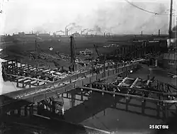 In 1866 Earle's Cement acquired the cement works on the near the river bank and land south of the Victoria Dock Branch Line; the works was connected by rail sidings to the dock branch.[map 5] Production was around 3000t pa of Roman cement in 1870. From 1875 bottle kilns were constructed for the production of Portland cement, with a capacity of 38t per week by around 1882. From 1888 chamber kilns were installed, with 28 in total by 1898 with a total capacity of 980t per week. The first two Rotary kilns were installed in 1906, adding a capacity of 860t per week. Further rotary kilns were added in 1912 and 1920, by which time the location of the plant was seen as non-optimal, Earle's large plant in Hope, Derbyshire being preferred.[14]