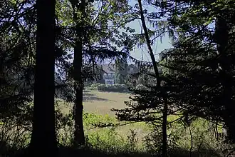 The largest building of Wilpen Hall, seen through the trees at the edge of the property | |