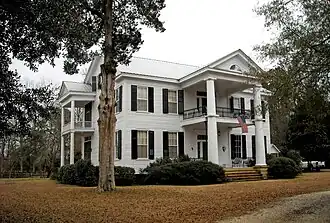 The two-story Greek Revival-style house is wood-frame with limestone ashlar foundations and front columns, an unusual feature in Alabama. The limestone, with visible marine fossils present, was quarried locally, at the Gainestown Quarry on the Alabama River.[3] The house is rectangular in form and utilizes a central hall-type plan. A central two-tiered Doric portico fronts the structure. A louvered fanlight is centered in the pediment above the portico.[1]