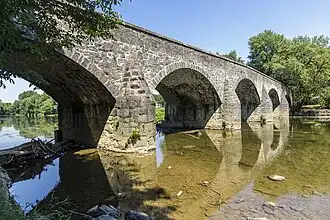 Wilson's Bridge is a bridge near Hagerstown, Washington County, Maryland, United States. It originally carried the Hagerstown and Conococheague Turnpike, the National Road, across Conococheague Creek 7 miles (11 km) west of Hagerstown. The five-arched structure, the longest of the county's stone bridges, is 210 feet (64 m) in length and is constructed of coursed local limestone. The bridge was erected in 1819 by Silas Harry, who had built similar bridges in Pennsylvania. The bridge was closed in June 1972 when it was damaged by floods which occurred during Tropical Storm Agnes.[2]