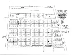 A plat was drawn in 1893 which divided 36.53 acres of the farm into regular streets and lots for development. Legal fights between the family and the city delayed sales but began in 1898 and picked up pace in 1902 when commercial real estate companies were used to market the development.[1]