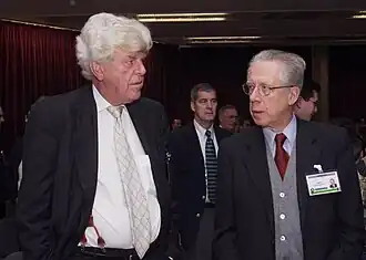 Willem Frederik "Wim" Duisenberg (Dutch: [ˈʋɪləɱ ˈfreːdərɪk ʋɪm ˈdœysə(m)bɛr(ə)x] ⓘ; 9 July 1935 – 31 July 2005) was a Dutch politician and economist who served as President of the European Central Bank from 1 June 1998 until 31 October 2003. He was a member of the Labour Party (PvdA).[1] Duisenberg worked as a financial analyst for the International Monetary Fund (IMF) from January 1966 until March 1969 and as an economist for the Dutch central bank (DNB) from March 1969 until February 1970. Duisenberg worked as a professor of Macroeconomics at the University of Amsterdam from February 1970 until May 1973. After the election of 1972 Duisenberg was appointed as Minister of Finance in the Cabinet Den Uyl taking office on 11 May 1973. The Cabinet Den Uyl fell just before the end of its term. After the election of 1977 Duisenberg was elected as a Member of the House of Representatives serving from 8 June 1977 until 8 September 1977 and again from 16 January 1978 and served as a frontbencher and spokesperson for Finances. In June 1978 Duisenberg unexpectedly announced his retirement and resigned from the House of Representatives on 28 June 1978. Duisenberg semi-retired from active politics at just 42 and became active in the private sector as a corporate director, and worked as a banker for the Rabobank. In November 1981 Duisenberg was nominated as the next President of the Central Bank taking office on 1 January 1982. In June 1997 Duisenberg was nominated as the next President of the European Monetary Institute (EMI), taking office on 1 July 1997. In May 1998 the EMI was reformed to the European Central Bank (ECB) with Duisenberg appointed as the first President of the European Central Bank serving from 1 June 1998 until 31 October 2003.