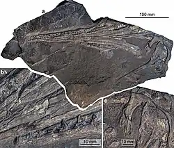 Among the most common of the invertebrates from the Besano Formation is the bivalve Daonella.[18] Many gastropods are known from the Besano Formation; predominantly those that could have lived as plankton or on algae.[17] Cephalopods present include nautiloids, coleoids, and the especially common ammonites.[18] The coleoids from the Besano Formation are not particularly diverse, but this may be due to their remains not readily fossilizing, with many of their known remains being preserved as stomach contents within the bodies of ichthyosaurs.[6][18] Arthropods known from the formation include ostracods, thylacocephalans, and shrimp. Other, rarer invertebrate groups known from the formation include brachiopods and echinoids, which lived on the seabed.[18][16] Radiolarians and macroalgae are also known in the formation, though the latter may have been washed in from elsewhere, as with many other bottom-dwelling organisms.[18] A very large number of bony fish have been recorded in this formation.[18][19][20] Many bony fish have been recorded in this formation, with actinopterygians being quite diverse, including abundant small species as well as larger representatives like Saurichthys, though rarer sarcopterygian coelacanths were also present.[19][20][18] The cartilaginous fish of the Besano Formation are uncommon as well and mainly consist of hybodonts.[21][18]