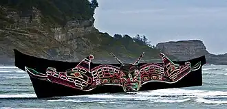 Winalagalis is associated with a magical war canoe (alternately described as made of copper, a sisiutl, invisible, able to travel underground, & permanently fused with Winalagalis). He is also described as thin, tall, black, with bat-like eyes. (Jonaitis 100)