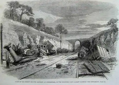 The accident occurred at night at the location near Winchburgh where the Edinburgh and Glasgow Railway passes through a cutting on a curve.[4] During the night of the accident, only one line was in use due to track maintenance when two trains met head-on. The drivers saw each other when they were some 300 yards (270 m) apart and managed to slow down so that their relative speed was under 30 mph (50 km/h) when they collided. The driver of the Glasgow train leapt clear prior to the impact and survived though badly injured, but both firemen and the driver of the other train along with 15 passengers were killed and between 35 and 100 injured.[4] One of the passengers made their way to a local home named Craigton House and commandeered a horse and cart to drive over 4 miles (6.4 km) to Linlithgow, raise the alarm and summon doctors to the scene. A special train arrived from Edinburgh bringing workmen who laboured all night to free the dead and injured, and then to clear the wreckage; indeed the line was back in use the following day.