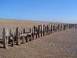 Across the road from the churchyard stands the Court Hall, one of Winchelsea's oldest buildings, the lower floor once being the gaol.[7] The first floor is now a museum, full of relics of the history of Winchelsea, the Corporation, and a model of the town. Nearby is the town well, dug in 1851 to save water being carried up the hill. It is thought to be 80 feet deep.[8] At the foot of Strand Hill stands the town workhouse Strand House just behind the port area of Winchelsea which runs along the river bank on the far side of the main road. This area contains the remains of several old buildings, such as the Old Malt House and Appletree Wick while Strand House itself was built around 1425 according to dendrochronology. These buildings made up the workhouse of the parish of Winchelsea being known as "The Old Poor Houses".[9] The area was a subject of archaeological investigation in 2013 which found the remains of the medieval wharf and a medieval boat next to the Bridge Inn.[10]