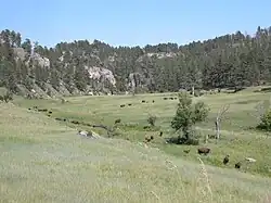 The American bison (Bison bison) once numbered in the millions, perhaps between 25 million and 60 million by some estimates, and they were possibly the most numerous large land animal on earth. However, they were hunted to near extinction throughout North America by the late 1880s. The Wind Cave bison herd was started with 14 bison from the New York Zoological Society and with six animals from the Yellowstone Park bison herd.[1] In addition, in the 1960s, a bull bison was received from Theodore Roosevelt National Park.[2] The Yellowstone Park bison herd was the last free-ranging bison herd in the United States and the only place where they did not go locally extinct, so they have become part of the foundation stock for many other herds. The Wind Cave population has served as the foundation stock for the Tallgrass Prairie bison herd in Kansas.[3] The National Park Service is working with The Nature Conservancy to establish additional satellite herds with the goal of having a total population of at least 1,000 breeding bison of Wind Cave lineage.[4][5]