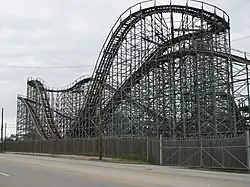 In its original form, Twisted Twins was a dueling roller coaster, which featured two roller coaster tracks that departed from opposite ends of a single station. The two tracks followed different paths, passing by each other four times.[28] Despite this, both tracks measured 3,000 feet (910 m) in length, stood 80 feet (24 m) tall, and featured top speeds of 55 miles per hour (89 km/h).[4] The ride was the only dueling roller coaster manufactured by Custom Coasters International, and was one of only two dual-tracked roller coasters manufactured by the company (Stampida at PortAventura Park is a racing roller coaster).[29][30] The ride was designed by Dennis McNulty and Larry Bill, a duo responsible for many of the company's roller coasters.[4][31][32] Construction of Twisted Twins was completed by Martin & Vleminckx.[4]