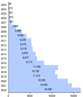 | 2022 | 16,568 | 1,610 | 1,517 | 1,684 | 1,710 | 1,444 | 1,130 | 936 | 974 | 1,195 | 1,368 | 1,619 | 1,381 |