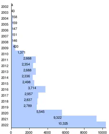 | 2022 | 10,325 | 917 | 967 | 1,089 | 1,070 | 711 | 715 | 683 | 661 | 756 | 919 | 991 | 846 |