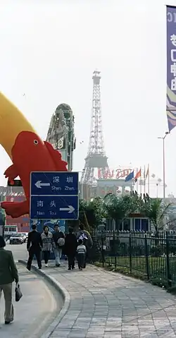The Window of the World (Chinese: 世界之窗; pinyin: Shìjiè zhī Chuāng; Jyutping: sai3 gaai3 zi1 coeng1) is a theme park located in the western part of the city of Shenzhen in the People's Republic of China. It has about 130 reproductions of some of the most famous tourist attractions in the world squeezed into 48 hectares (118 acres). The 108 metre (354 ft) tall Eiffel Tower dominates the skyline and the sight of the Pyramids and the Taj Mahal all in proximity to each other are all part of the appeal of this theme park.