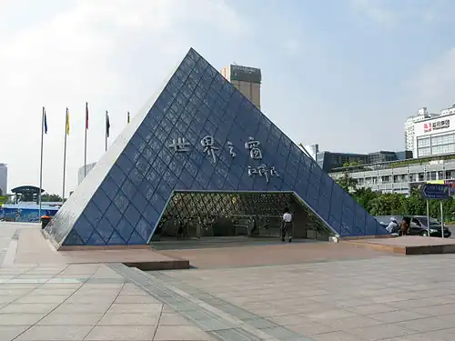 Window of the World station (Chinese: 世界之窗站; pinyin: Shìjièzhīchuāng Zhàn; Jyutping: Sai3 Gaai3 Zi1 Coeng1 Zaam6), formerly Shijiezhichuang station is a station on Line 1 and Line 2 of the Shenzhen Metro.[2] The Line 1 platforms opened on 28 December 2004 and the Line 2 platforms opened on 28 December 2010 as the terminus. It is located underground at the north of Window of the World in Shennan Dadao, Nanshan District, Shenzhen, China. It provides access to two of the theme parks in Shenzhen, Window of the World and Happy Valley.[3]