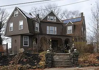 Thomas Winans, the son of inventor Ross Winans, had an interest in land speculation and owned some of the land that would become Windsor Hills. The first two residences constructed in Windsor Hills were a pair of Italian villas built sometime after the Civil War and were named Tusculum and Monticello after local schools rub by Adele and Alfred Bujac. One of the Monticello remained standing until being torn down by the City of Baltimore in 1925 and replaced by an elementary school. Tusculum would likewise be replaced by the Mt. Shiloh AME Church. Edwin L. Tunis purchased the holdings of Thomas Winans and several others in 1889. The Tunis family settled in the area and heavily influenced the regional style that would develop.[3] Windsor Hills developed over a period from about 1895 through 1930. The dominant styles include Shingle cottages, Dutch Colonial Revival houses, Foursquares, and Craftsman Bungalows.[4] Trolley service to downtown Baltimore began in 1902.[3]