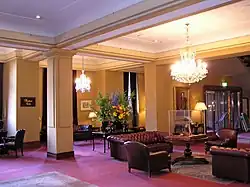 Oberoi undertook a major restoration of the hotel in 1983 costing US$6.6 million, reinstating the decorative 19th century colour schemes to the lobby, stairhall, and especially the Grand Dining Room, where huge brass chandeliers were reproduced from photographs.[6] This was one of the first major private historic restorations in Melbourne, and won a Victorian Architect's Institute award.[7] Its position as a leading five-star hotel and a major Melbourne landmark was then firmly re-established. The cricketer's bar, afternoon tea in the grand dining room, and the top-hatted doorman all resumed their status as Melbourne institutions. The John Cain II state government sold the hotel to the Oberoi Group giving the company freehold possession in 1990. In 2005, Oberoi sold the hotel to the Halim family based in Indonesia.[8]