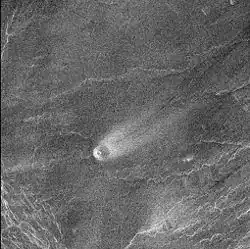 A windstreak is a planetary surface feature of aeolian origin characterized by an albedo that contrasts with surrounding surface in an elongated pattern.[1][2] Windstreaks are associated with topographical obstacles,[1] and are very commonly, but not exclusively, found near craters.[3] These features have been observed on Mars, Venus, Titan, and the Earth,[4] although they are considered rare on Earth.[5] Terrestrial examples of windstreaks are found at the Pali-Aike volcanic field.