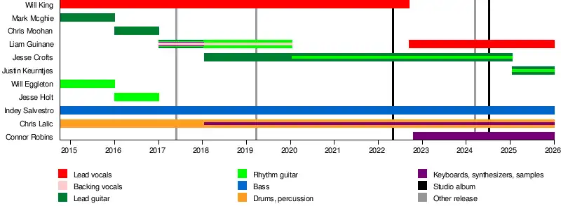 On 15 September, the band announced on social media that Will King had departed from the band to focus on studying psychology, and that former guitarist and backing vocalist Liam Guinane had returned to fulfill lead vocal duties.[34] After performing as a session member for 2022, Connor Robins was officially added to the band on keyboards and later featured on the band's follow-up single "Left in the Dark" released on 11 November with an accompanying music video.[35] On 12 July 2024, the band released their second studio album, Hyperviolence.