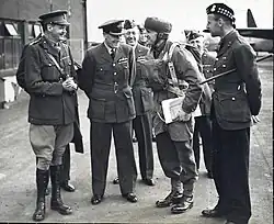Brigadier Gale (left) in conversation with Lieutenant Colonel Ernest Down (third from right), CO of the 1st Parachute Battalion, during an inspection of Down's battalion at RAF Ringway, 1941.