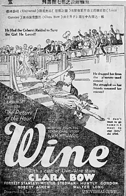 Wine is a 1924 American silent melodrama film directed by Louis J. Gasnier, produced and released by Universal Pictures under their 'Jewel' banner.[1] The film, which featured Clara Bow in her first starring role, is currently classified as lost.[2][3]
