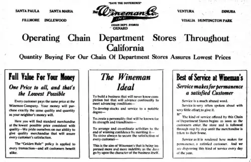 7. ^ "Welcome Extended to Wineman Store". Oxnard Press-Courier. August 20, 1924.
