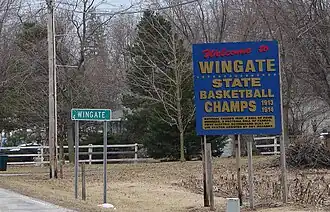 Signage on the north and south ends of town (shown right) along Indiana State Road 25 boast that, following the first Indiana State Basketball Championships that were held in 1911, the Wingate team was the first to win back-to-back championships in 1913 and 1914.[9] The same sign also mentions that Wingate produced four Indiana Basketball Hall of Fame inductees—Homer Stonebraker,[10] Jesse Wood,[11] Lee Thorn[12] and Alonzo Goldsberry[13]—and two football hall of famers. The Basketball Hall of Fame inducted a fifth player, Forest Crane, in 2013.[14] Wingate was the site of the first electric basketball scoreboard; it was invented in 1935 by two local men, Lee Haxton and Roy Meharry.[15]