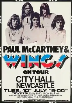 Wings' line-up for the tour was Paul and Linda McCartney, Denny Laine, Henry McCullough, and Denny Seiwell.[3] Shows lasted for around an hour or so.[4] Wings presented a different image on stage during the tour's shows than they did on record, being respectively "undeniably vigorous and invigorating" rather than "tame, even lame," as Tony Palmer wrote for The Observer after seeing the tour's opening night at the Bristol Hippodrome.[4] The band had somewhat more material to play than they had in previous outings, and McCullough's instrumental "Henry's Blue", previously used to fill out the setlist, was not employed.[5] Laine's singing of his former band The Moody Blues' hit "Go Now" was included, however.[4]