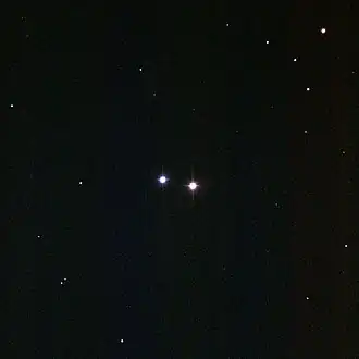 In 1991 the separation between the components was measured at 51.7″, an increase since 1764. Data gathered by astronomers Brian Skiff (2001) and Richard L. Nugent (2002) strongly suggested the subject was merely an optical double star rather than a physically connected (binary) system.[5] The A star that seems the brighter is over twice as far as B.[11] Parallax measurements from the Gaia satellite show the two stars, HD 238107 and HD 238108, are at distances of 311 ± 1 parsec (1,013 ± 4 light-years) and 144.2 ± 0.3 parsecs (470 ± 1 light-year) respectively. HD 238108 is itself a genuine binary star, with an 18th magnitude white dwarf companion 5 arcseconds away and a parallax distance of 146.8 ± 2.3 parsecs (479 ± 8 light-years).
