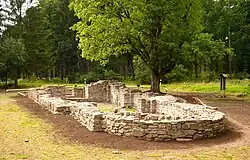 The village had a church that was built of stone in the years around 1200 in romanesque architectural style. The aisle had two bays. The choir was rectangular. The height of the tower was 15 to 20 meters by estimation. In the early modern period, people tore down the church in order to pave the street passing by. In 2006, the local historical society reconstructed the foundation walls of the church.