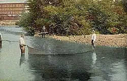 The river's lower section begins at the natural outlet of Silver Lake, on the boundary between Belmont and Tilton, New Hampshire. The river passes through the center of the twin towns of Tilton and Northfield, then descends through a narrow valley to Franklin where additional small dams use the river's power. From Tilton to Franklin, the river has a drop of up to 90 feet per mile (17 m/km), with challenging rapids for sport boaters who put in at Cross Mill Bridge and take out at the U.S. Route 3 Sanborn Bridge in downtown Franklin. A USGS water gage is in Tilton.[2]