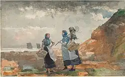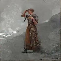 Back in the U.S. in November 1882, Homer showed his English watercolors in New York. Critics noticed the change in style at once, "He is a very different Homer from the one we knew in days gone by", now his pictures "touch a far higher plane ... They are works of High Art."[30] Homer's women were no longer "dolls who flaunt their millinery" but "sturdy, fearless, fit wives and mothers of men" who are fully capable of enduring the forces and vagaries of nature alongside their men.[31]