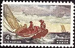 In 1962, the U.S. Post Office released a commemorative stamp honoring Winslow Homer. Homer's famous oil painting Breezing Up, now hanging in the National Gallery in Washington DC, was chosen as the image for the design of this issue.[55] On August 12, 2010, The Postal Service issued a 44-cent commemorative stamp featuring Homer's Boys in a Pasture at the APS Stamp Show in Richmond, Virginia.