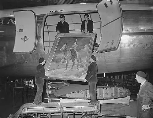 In 1947, Winston carried King George VI during the first Trooping of the Colour to take place since 1939. Winston participated in various roles in other Royal ceremonial events when not working as a police horse. From 1949 to 1951, then Princess Elizabeth took her father's place at the ceremony, becoming the first British Queen since Elizabeth I to review her troops on horseback.[3] Though other police horse were made available, the Queen always preferred Winston.[4] The year of 1951 led to the future Queen first wearing her red Guards uniform; prior to this she wore a blue uniform.[5]