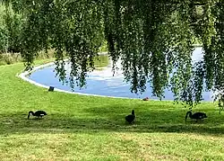The black swans mated, as did their offspring with each other, and by 1935 there was a small herd.[19][13] In July 1938, three of the black swans left Chartwell in what biographer Stefan Buczacki has called "a celebrated avian burst for freedom".[13] Buczacki writes, "the local and national press pounced on the story and accounts ensued of 'Chartwell black swans' being spotted on the Thames, at Dartford, at Sheerness, heading for the Isle of Wight and across much of southern England".[13]