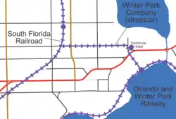 The company built a mule-drawn streetcar line, known as the Seminole Hotel Horse Car, along New England Avenue from the Seminole Hotel at the east end of New England Avenue, west to the South Florida Railroad (later Atlantic Coast Line Railroad) station. The tracks were later extended south on Ollie Avenue to the Orlando and Winter Park Railway (later Seaboard Air Line Railroad) station. Tracks were removed in 1903.[1]