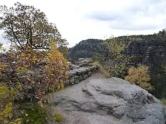 The Winterstein, also called the Hinteres Raubschloss, is an isolated, elongated rock massif in the hinterland of Saxon Switzerland in East Germany. On the summit there was once a medieval castle, also called Winterstein, of which remains such as rebates for timber beams, hewn-out steps and cisterns are still visible.