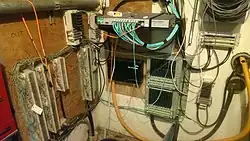 A wiring cupboard is a small room commonly found in institutional buildings, such as schools and offices, where electrical connections are made. While they are used for many purposes, their most common use is for computer networking where it may be called a premises wire distribution room (PWD room). Many types of network connections place limits on the distance between end user equipment, such as personal computers, and network access devices, such as routers. These restrictions might require multiple wiring cupboards on each floor of a large building.