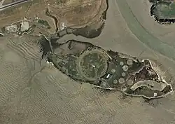 Wiroa Island is located southeast of the Auckland Airport complex and is only connected to the mainland by a narrow, approximately 370-metre-long (1,210 ft) causeway, on which a road leads to the island. The approximately 38.7-hectare (96-acre) island has a length of around 1.4 kilometres (0.87 mi) in a west-northwest–east-southeast direction, and measures around 390 metres (1,280 ft) in a north-northeast–south-southwest direction at its widest point. The island lies less than five metres (16 ft) above the water level of the Manukau Harbour.[1] As the island is a part of the Auckland Airport complex, it is inaccessible to the public.[2] It is the 2nd largest island in the Manukau Harbour, after Puketutu Island and before Pararekau Island in the SE corner of the harbour.
