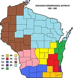 Following the 1870 census Wisconsin gained two seats in the House of Representatives. The new 6th District was shifted eastward and included many counties in northeast Wisconsin. It included the counties of Brown, Calumet, Door, Green Lake, Kewaunee, Outagamie, Waupaca, Waushara and Winnebago. Representative Philetus Sawyer of Oshkosh had been elected to Congress from Wisconsin's 5th District since 1865, was then elected from the newly configured 6th District. He later served the state as a member of the U.S. Senate.
