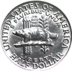 The reverse features a badger, the Wisconsin state animal. Behind it are three arrows, symbolic of the conflict between settlers and the Black Hawk Indians, with an olive branch, marking the peace that paved the way for the establishment of the territory,[29] or, as Anthony Swiatek and Walter Breen put it in their 1988 book on commemorative coins, "the massacre and expulsion of the Indians that made the area safe for white settlers".[28] The name of the country, the coin's denomination, and the inscriptions required by law surround the pictorial design.[29] Hawkins's initial H appears below the badger,[30] which represents Wisconsin's early fur-trading days; both sides of the half dollar emphasize the natural resources of the state.[31]