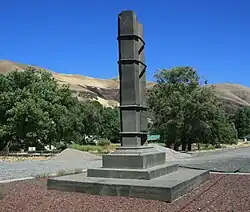 In 1926 a pioneer memorial was raised at Wishram/Fallbridge. Still located in its original position 100 feet (30 m) east of the passenger train station today, it consists of two columns of basalt bound together with iron straps and mounted on a pedestal. A bronze plaque recognizing various pioneers who have been to Wishram begins with Meriwether Lewis and ends with John C. Fremont. It originally marked the beginning of a 1⁄2-mile (0.8 km) path from that monument to Celilo Falls; that path is now covered by the backwaters from The Dalles Dam.[10]