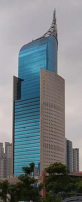 This building has a modern design and also a unique appearance, which is curved shaped like a pen and fully covered by square patterned glass facade. On either side of the tower, the glass facade is covered by a hollow concrete wall that is also square shaped.[8] Because of its uniqueness, this skyscraper is one of the icons of Jakarta after Monas.[9]