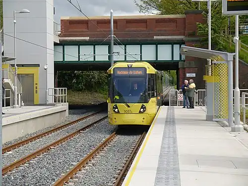 Funding was limited, and re-opening the former midland line took place in segments; in 2006, it was announced that the Metrolink network would extend as far St Werburgh's Road (opened 2011),[6] and in 2008 with funding from the Greater Manchester Transport Fund was granted to extend the line to East Didsbury.[7][8][9] Tram tracks were laid along the former trackbed, and a new intermediate tram stop was constructed by the Princess Road bridge next to Hough End Playing Fields. Withington Metrolink stop opened on 23 May 2013.[1][10] Further south along the line, the original Withington railway station was not re-opened, but was replaced with a new Metrolink stop, West Didsbury, in close proximity to the old station site.