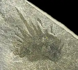 Wiwaxia is a genus of soft-bodied animals that were covered in carbonaceous scales and spines that protected it from predators. Wiwaxia fossils—mainly isolated scales, but sometimes complete, articulated fossils—are known from early Cambrian and middle Cambrian fossil deposits across the globe.[4][7][8] The living animal would have measured up to 5 centimetres (2 in) when fully grown, although a range of juvenile specimens are known, the smallest being 2 millimetres (0.08 in) long.[8]