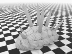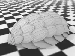 The animal was covered in eight rows of small ribbed armor plates called sclerites; these lay flat against the body, overlapped so that the rear of one covered the front of the one behind, and formed five main regions—the top; the upper part of the sides; the lower part of the sides; the front; and the bottom. Most of the sclerites were shaped like oval leaves, but the ventro-lateral ones, nearest the sea-floor, were crescent-shaped, rather like flattened bananas, and formed a single row. Larger specimens (>~15 mm) bear two rows of ribbed spines running from front to rear, one along each side of the top surface, and projecting out and slightly upward, with a slight upward curve near the tips. Although the spines in the middle of each row are usually the longest, up to 5 centimetres (2 in) long, a few specimens have rather short middle spines that represent part-grown replacements.[8]