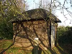 The churchyard also contains a grade II listed horsehouse of hurdle and gorse with a thatched roof dating from the 18th century.[10] Wixford never having a separate living, being a chapel of Exhall since the reformation so it was provided for the mounts of the visiting clergy from other parishes. There is also a fine large base of a churchyard cross with a moulded top edge, the stump of a shaft, and three steps to the platform dating from the 15th century.[6] For much of the late 19th and early 20th century people travelled from Alcester to the Sunday evening services in St Milburga's. The remains of Oversley Castle are zero point five miles (0.80 km) north of the village and the Roman road Icknield Street runs very close by.