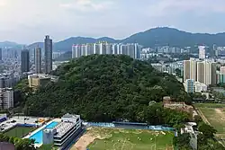 The top of the hill is the site of a former service reservoir of the Water Supplies Department, officially known as Ex-Sham Shui Po Service Reservoir, previously known as the Sham Shui Po Fresh Water Break Pressure Tank, that was disused due to structural issues.[2] Demolition of the covered (underground) reservoir began in December 2020, but was halted after the works revealed well-preserved Roman-style arches dating to 1904.[3] The Antiquities and Monuments Office was summoned to assess the site.[2][4] Heritage groups, lawmakers, district councillors, and members of the public have called for the structure's preservation. Comparisons have been made to Paddington Reservoir Gardens, in Sydney, a successful conversion of a similar historic reservoir to a public garden.[5][6]